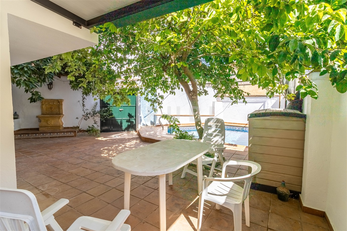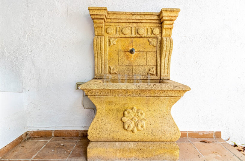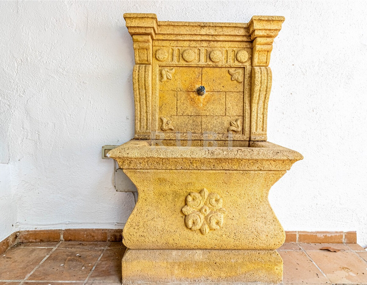 The ground floor sets the tone for relaxed Mediterranean living, featuring a spacious open-plan lounge with fireplace, kitchen, and access to the patio. Outside, a serene world awaits: a private pool, a stone fountain, shaded dining areas, and a versatile room ideal for a summer kitchen or guest studio.